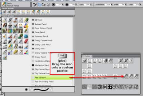 These default brushes along with custom variants of them are the main brushes used in this painting. I will hold down the Shift key and drag the individual brushes as well as paper textures into a custom palette. This makes accessing them as I paint quicker.