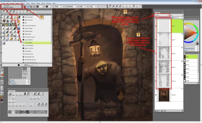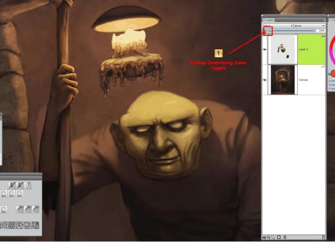 Now I spend a great deal of time refining and changing the figure. Up to this point much of the painting on the doorman has been experimental in nature. I am going for the final look of the character. I will also add a few extra touches like a key ring full of skeleton keys and change the lantern to a candle. Most of the painting is done with the Opaque Round brush on a new layer. When painting on a new layer I make sure that I have the Pickup Underlying Color toggle turned on so my strokes blend smoothly with the canvas colors. When turned on, the small dropper icon is blue.