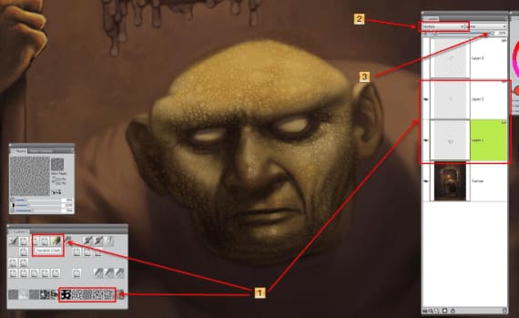 1. Using the Variable Chalk brush, a variety of different paper textures, and creating new layers I paint texture loosely over the skin areas with a colors slightly darker than already present.