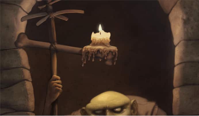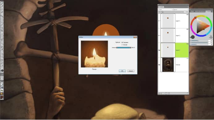 A new layer is created and a small candle flame is painted on the top of the candle. The flame layer is duplicated. The bottom flame layer is softened, the composite method changed to screen, and the opacity lowered to give a nice subtle glow to the flame.
