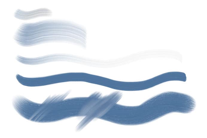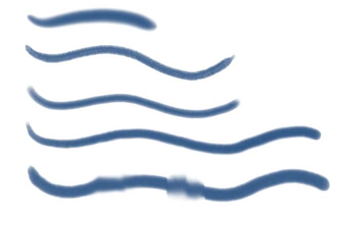 The second figure shows the Oils brushstrokes, with the bottom stroke smudged using the Real Blender Flat and Real Blender Round variants of Blenders. Most of the Blenders smear pixels without applying new color.