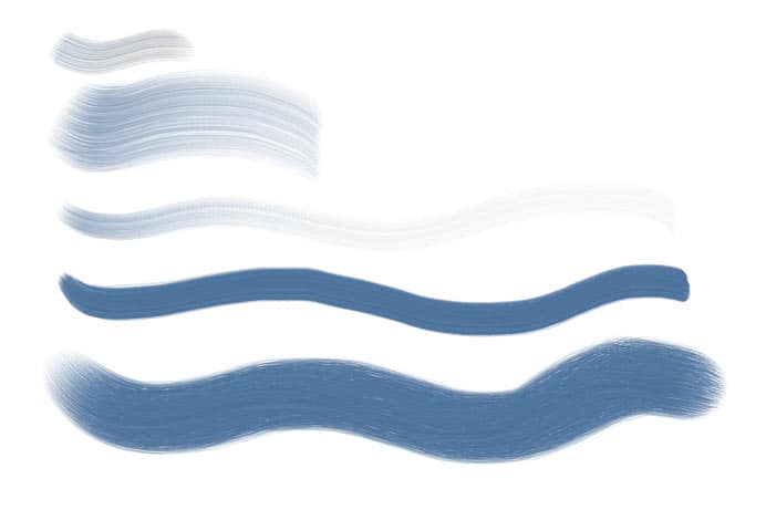 The third example shows brushstrokes painted with several Real Wet Oils variants, including the Liquid Oil, Wet Bristle, and Wet Oil. In this figure, the lower brushstroke is smudged with the Turp and Turp Grainy variants of Real Wet Oils.