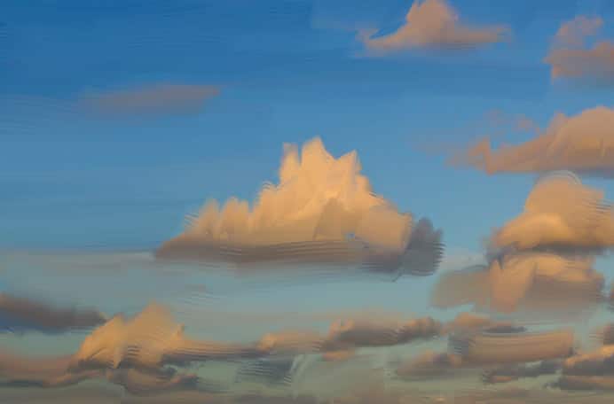 Take another careful look at the highlights in your image and look for any suggestion of movement that will inspire the direction of your strokes. In this image, the midtone and highlight areas of the puffy cumulus clouds are painted using shorter, curved strokes to model the airy forms. When you are pleased with the understudy, save a new version of the file.