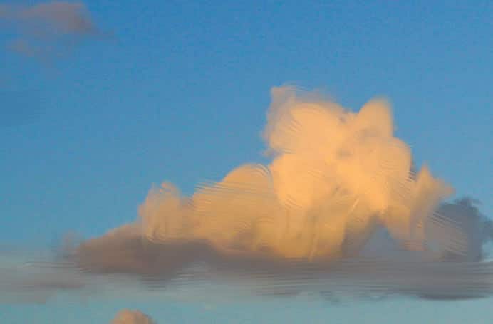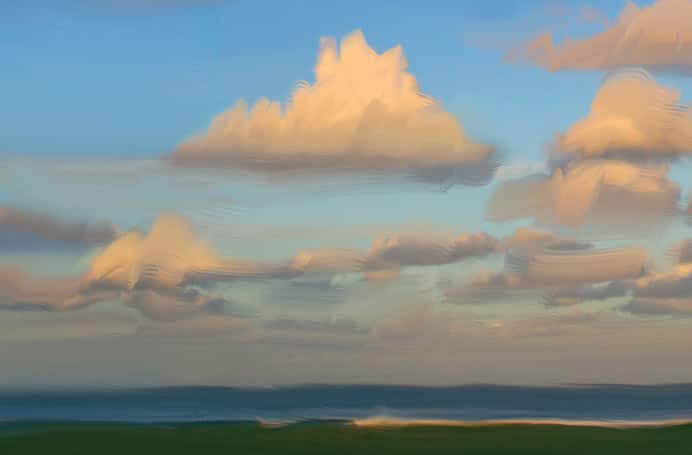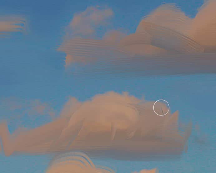Before you begin painting the clouds, study your photograph carefully. Which direction does the light shine from? Where are the highlights, midtones and shadows? In this photograph, the clouds are lit from above and slightly from the left side. The loose brushwork on the sky and clouds is painted using the Real Blender Flat variant of Blenders, varying the size of the brush while working over broad or fine areas. (Try 25–50 pixels.) If the size of your file is much smaller or larger, you'll want to proportionately adjust the sizes of your brushes in Steps 3–4.