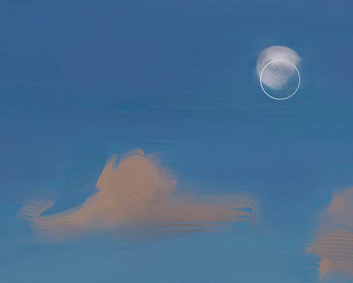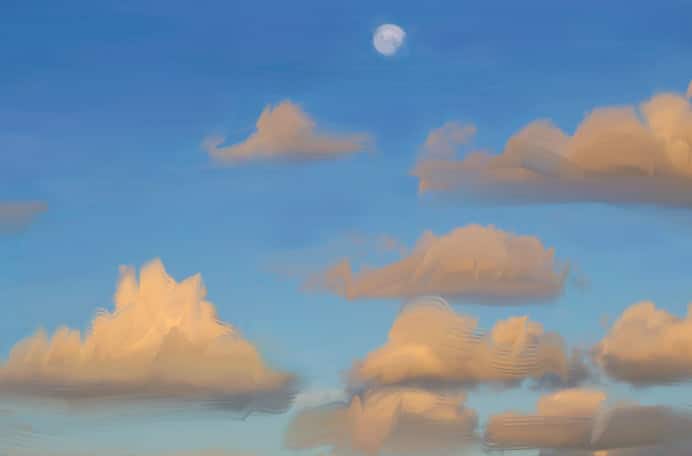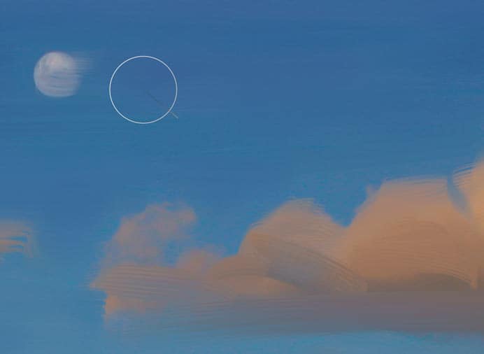 Now, choose the Liquid Oil variant of Real Wet Oil. With the Real Wet Oils, you can apply paint with a liquid feel and then push and pull pigment with blenders, for instance the Turp and Turp Grainy variants of Real Wet Oil. The Liquid Oil variant is used to apply brighter highlights to the moon and to the tops of a few of the clouds. To finish the painting, the Turp variant of Liquid Oil is used to soften edges of a few of the background clouds.
