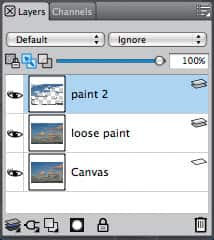 The first stage of the painting is the loose understudy, built by smearing the pixels on the photograph and loosely painting over the entire photographic image. In this project, painting is done on a copy of the Canvas layer. To put a copy of the Canvas on a layer, choose Select > All and then press the Alt/Option key and choose Select > Float. With the layer selected, turn on the Pick Up Underlying Color check box on the Layers panel.