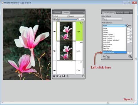 - In the Underpainting panel, choose Black And White from the Photo Enhance list box, or drag the Saturation slider all the way to the left, and then click the Apply Underpainting button at the bottom of the panel. This will change the image from color to grayscale (see Figure 3).