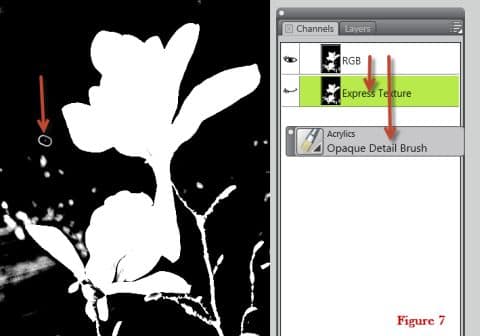 Note: This particular image was fairly easy to convert into a black and white image, but it wasn't perfect. After making the channel, you can paint directly on the channel to get the image as a black and white selection. In my example, I am not painting around the outline, but covering white spots. To paint in the channel, select the channel in the Channels panel and select a versatile brush or pen. You cannot use any of the wet brushes or plugin types. Corel Painter will warn you if you have selected an ineligible brush. Turn the eye icon beside the RGB channel off, which will display the channel in grayscale, or in this case exactly like the Express Texture image. Using black, paint out the white dots and streaks that are not flower or stems (see Figure 7).