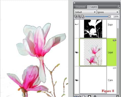 - In the Layers panel, select the color layer (Layer 1), and then press Delete (Mac OS) or Backspace (Windows). This will remove the background and you have the channel saved for future use (see Figure 8).