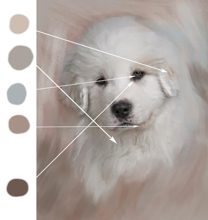 - From the toolbox, I click the Dropper tool or press D (shortcut key). With the Dropper tool, I click in the image to select a mid tone neutral color from Brutusʼ fur. I continue selecting colors from him (and then slightly boost the saturation/chroma on the color wheel in the Color panel).