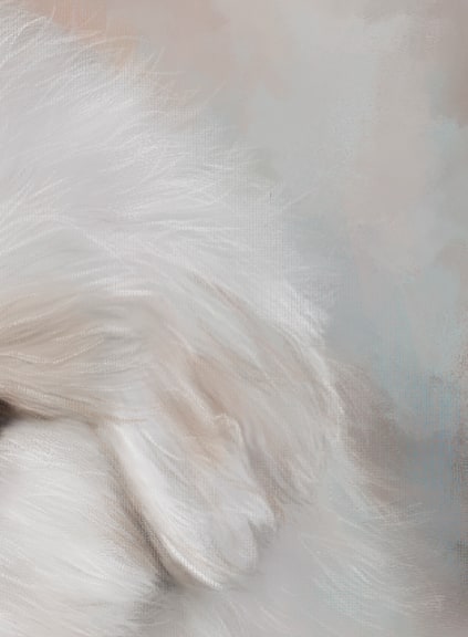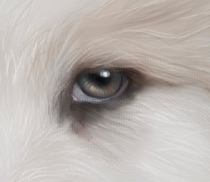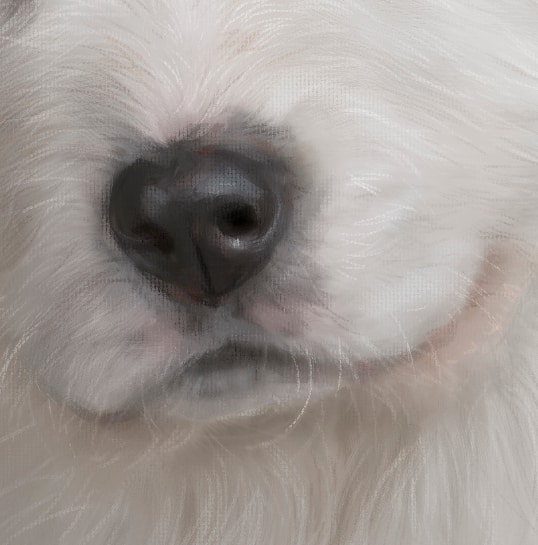 Now that Iʼve worked on the background, edges, and large areas of Brutus, Iʼm going to start honing in on the details of the ears, nose, and eyes. The very last touch will be refining any edges between Brutus and the background.