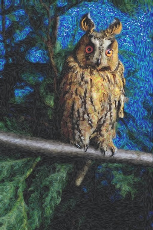 Night Owl was created with the Artists brushes, including the Auto Van Gogh brush variant and effect, as well as the Sargent Brush and the Seurat brush variants.