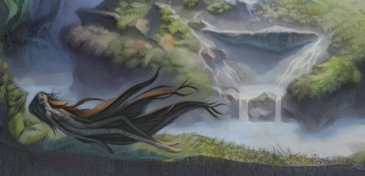 The problem with her is when she's front and center, she just grabs too much attention, almost like she's a goddess. That takes away from the whimsical story of the faerietank that we're trying to tell. When we place her to the side of the painting, we finally get the result that we want.