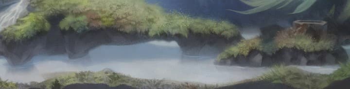 We wander our way through the painting, working up through the glimmering roof (making sure to keep it shiny), down through the doorway, grass, and waterfalls, towards the bottom.