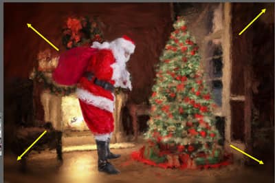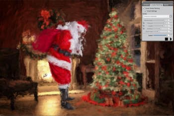 Although the image has now been painted, we are not yet finished. Due to the nature of the Impressionist brush, I have lost quite a bit of detail around Santa's face and beard, and the decorations on the Christmas tree have lost their definition. So the next step is to restore some of the original image detail back to our painting.