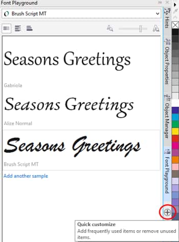 I now want to add some text to my card, so clicking on the Quick Customize icon in the Dockers panel, I am going to open up the Font Playground docker.