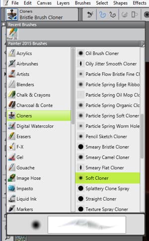 In the Brush Selector, drop down to the Cloners category, and in the panel on the right, choose the Soft Cloner. Adjust the size of the brush in the Property Bar.