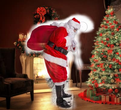 In my Clone Source panel, I now select my original background layer as the clone source, and choosing the Straight Cloner (which paints the original image back in with a hard, non-feathered edge), I can paint a sharp contour around Santa, bringing back the original background image. (Brush Selector > Category: Cloners > Straight Cloner).