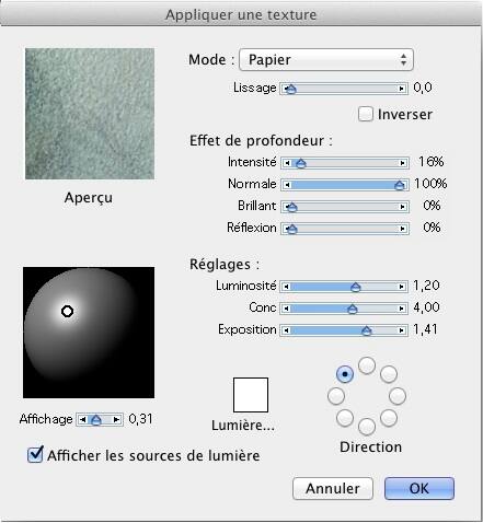 Pour commencer, on va appliquer à la toile, dans son ensemble, un léger soupçon de texture en cliquant sur Effets > Surface > Texture.