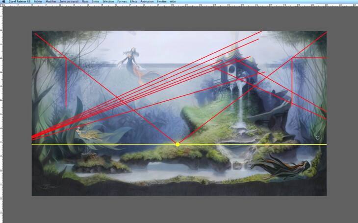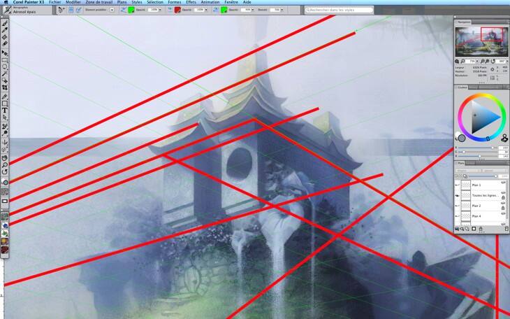 Cet outil de perspective à deux points me permet de bien tracer des lignes indiquant là où les bords du château devraient être.