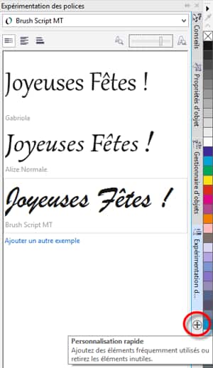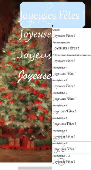 Je sais que deux des polices OpenType (Gabriola et Alize) sont associées à des alternatives de jeux stylistiques. Pour afficher les jeux stylistiques inclus, mettez le texte en surbrillance (une ligne à la fois), puis cliquez sur la flèche noire qui apparaît sous le texte si des alternatives de jeux stylistiques sont disponibles.