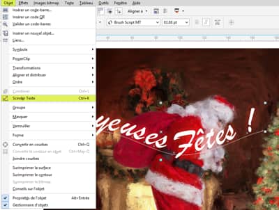Néanmoins, comme j'ai terminé, je n'ai plus besoin de ce tracé. Je sélectionne donc le menu Objet et je clique sur Scinder Texte (Ctrl+K). Je peux à présent supprimer le tracé.