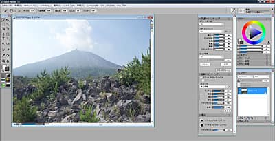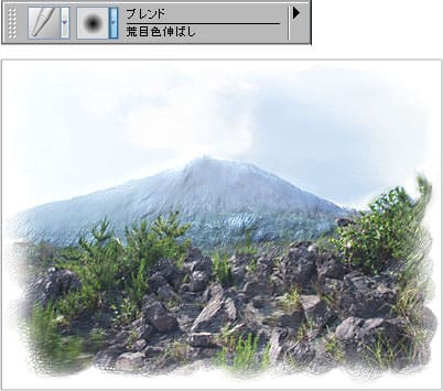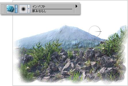 [インパスト]ブラシカテゴリの[厚みならし]を選びます。ペンタブレットの筆圧を小さめにして、山肌をサッと軽くなでるようにして、凹凸をなだらかにします。