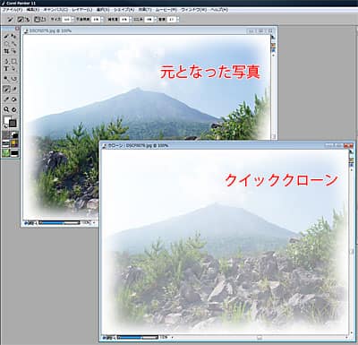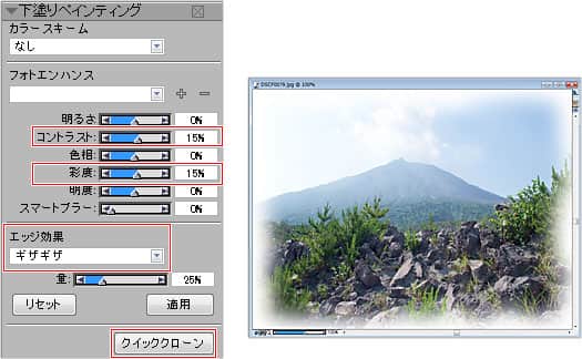 ここでは[フォトエンハンス]の[コントラスト]と[彩度]を「15%」に、[エッジ効果]を[ギザギザ]に設定して、[クイッククローン]をクリックします。