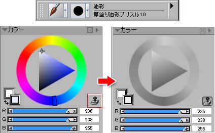 ブラシを選んだら、[カラー]パレットの[クローンカラー]をクリックして、クローンから色を取り込みながら描く方法を有効にしておきます。