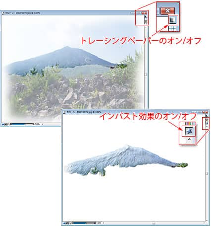 [トレーシングペーパーのオン/オフ]を切り替えながら、山裾を描き、岩の部分を置くの方から手前へと描き出していきます。